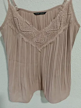 Elegante top lencero con detalle plisado y encaje. - Diseño con escote en V. - Tejido ligero y vaporoso. - Acabado con puntilla en el escote.