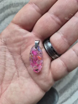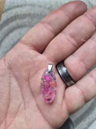 Colgante artesanal con incrustaciones de ópalo rosa y otros elementos. - Diseño ovalado. - Cierre de metal plateado. #opalo #mujer #rosa #joya #bonito #precioso