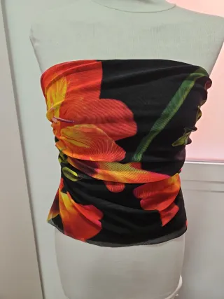Top de Zara con un llamativo estampado floral sobre fondo negro. El tejido es ligero y con un efecto fruncido. - Diseño sin tirantes. - Estampado de flores rojas y amarillas. - Tejido de malla.