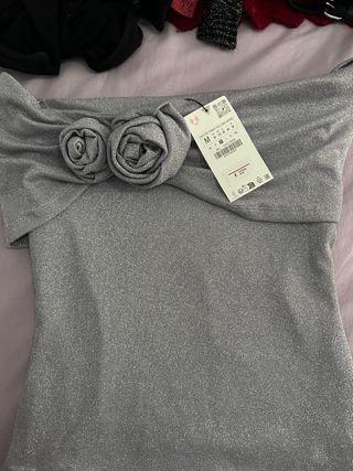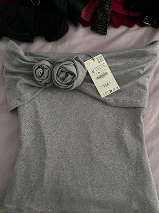 Top de fiesta de Zara con un diseño brillante y elegante. Perfecto para ocasiones especiales. - Tejido con acabado metalizado. - Detalle de dos flores decorativas en la parte delantera. - Diseño sin tirantes.