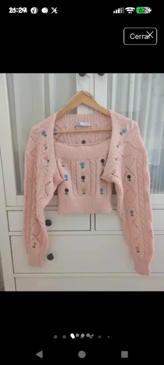 Conjunto de chaqueta y top de punto en color rosa con bordados de flores, talla top S , chaqueta bolero M, comprada así apropósito, queda más estiloso. Como nuevo, conjunto vintage viral de Zara. - Diseño de punto trenzado en la chaqueta. - Top con escote palabra de honor - Bordados florales multicolores. - Chaqueta corta manga larga