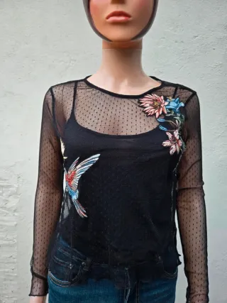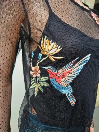 Top de tul con estampado de flores y colibrí de colores, precioso pero tengo demasiada ropa. Esta en perfecto estado.