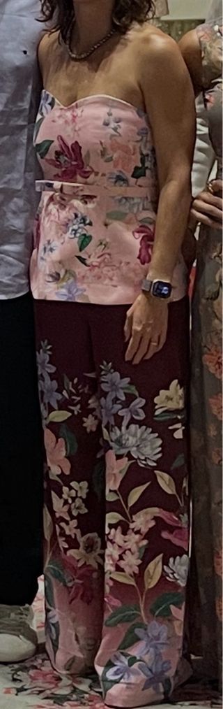 Top de Zara con un estampado floral vibrante sobre fondo rosa. Utilizado solo 1 vez para un evento. - Diseño sin tirantes. - Cintura marcada. - Estampado de flores multicolor.