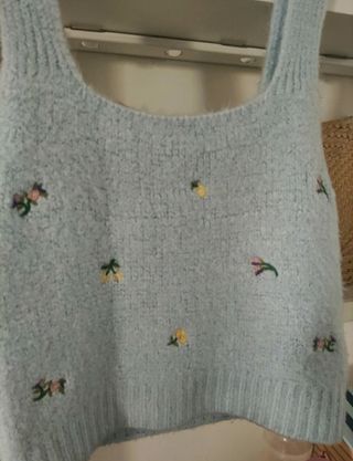 Suéter sin mangas en color azul claro con flores bordadas. Largo: 54 cm Ancho: 42cm