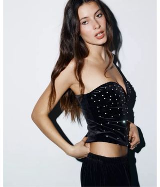 Top tipo corsé de Zara con un diseño llamativo. Presenta una tela negra adornada con múltiples incrustaciones brillantes que capturan la luz. - Diseño con pedrería. - Acabado satinado.