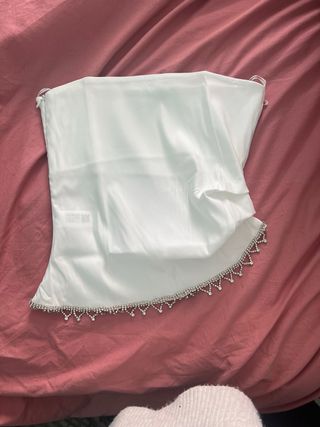 Precioso top de Zara, perfecto para ocasiones especiales. - Diseño sin tirantes. - Adorno de pedrería en el bajo. - Color blanco.