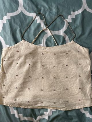 Top de Zara en color beige, adornado con pequeños detalles de pedrería y tirantes de cadena. - Diseño con pedrería multicolor. - Tirantes finos con detalle de cadena metálica.