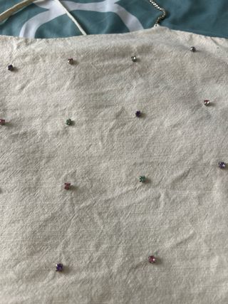 Elegante top sin mangas de Zara con un delicado detalle de pedrería en el cuello. - Cuello adornado con pequeñas pedrerías. - Diseño sin mangas. - Tejido ligero y fluido. falta alguna de las piedras por la parte trasera del cuello (ver foto)