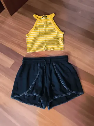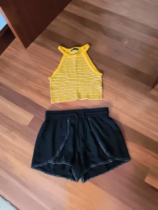 Conjunto de top a rayas amarillas de Zara y shorts negros de Ift - Top de tirantes con cuello halter. - Shorts con detalle de pasamaneria en el borde. - Cintura elástica con cordón.