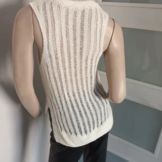 Es un top de punto calado sin mangas en color crema. El diseño presenta un cuello redondo y un patrón de rayas verticales con un efecto abierto o calado por toda la prenda Talla: M-L