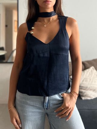 Top de Zara con un diseño moderno y favorecedor. Su tejido se adapta cómodamente. - Diseño asimétrico. - Detalle fruncido en el hombro. - Tirante fino.