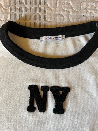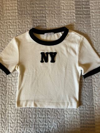 Camiseta corta de Zara con el logo NY bordado. - Diseño crop top. - Ribete negro en cuello y mangas.