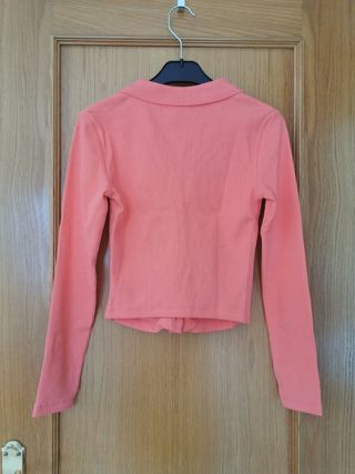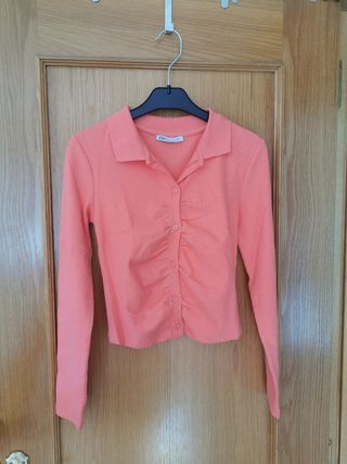 Top sin estrenar, sin etiqueta. Manga larga, apertura completa y fruncido en el pecho. Tejido canalé.