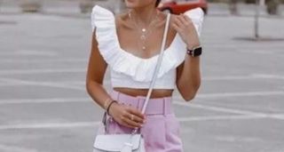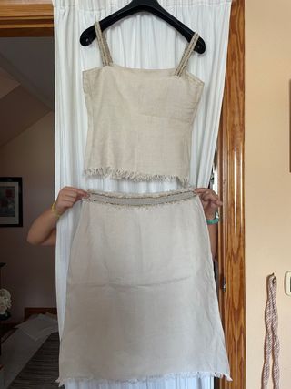 Conjunto de lino de Zara en beige con abalorios, top de tirantes y falda midi.