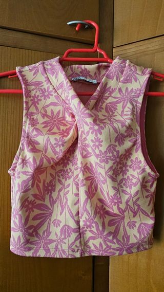 Conjunto de Zara. Estampado flores. Top asimétrico de tirantes finos regulables. Pantalón fluido cropped con cintura elástica SOLO ENVÍOS