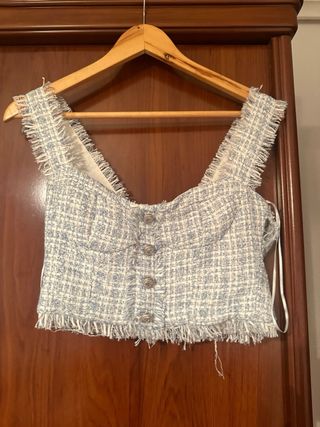 Top vaquero de Zara. Nuevo. Talla S corte suelto. Pecho y hombros en crochet. Es fresquito y de tela ligera. Para poner mucho. Composición: 100% algodon. Medidas: hombro 27 cm pecho 44 cm y largo 59 cm