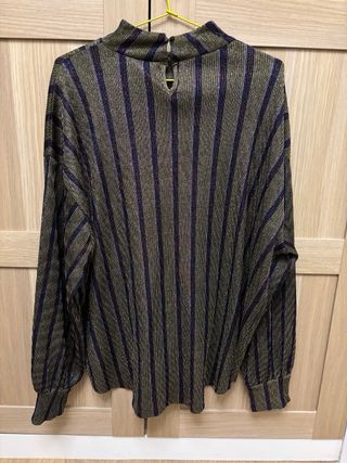Top de Zara con un tejido brillante y un diseño de rayas verticales. Cuello alto y mangas largas. Talla L. Palabras clave: nueva, larga, oversize, tirantes, manga corta, pantalón, vaquero, pitillo, jeans, camisa, camiseta, Slim, entallada, ajustada, bermuda, short, tejanos, corto, largo, marca, barato, zapatos, calzado, chino, vestir, sport, deporte, zapatillas, hombre, mujer, negro, rojo, blanco, blanca, azul, morado, rosa, beige, camel, marino, verde, militar, chico, chica, talla, s, m, l, XL, xxl, 34, 36, 38, 40, 42, nuevo, polo, gafas, sol, óptica, casa, hogar