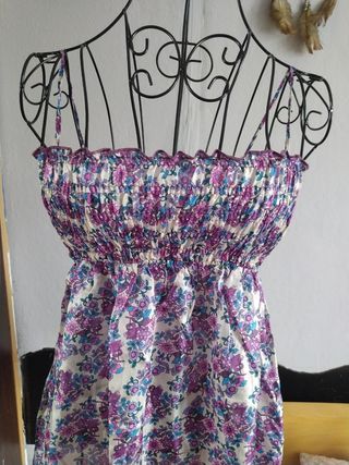 Precioso top de seda con un estampado floral vibrante. Perfecto para añadir un toque de color a tu armario. - Diseño con tirantes finos. - Cuerpo fruncido elástico. - Estampado floral en tonos morados y azules.