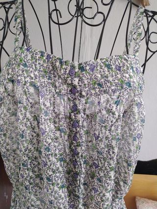 Precioso top de seda con un delicado estampado floral. Es ligero y tiene un diseño muy femenino. - Tirantes finos. - Cierre de botones en la parte delantera. - Detalle de volante en el bajo con cordón ajustable.