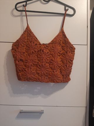 Precioso top de tirantes de Zara. Ideal para un look fresco y veraniego. - Diseño con detalles de encaje. - Cierre de botones en la parte delantera. - Tirantes finos con detalle rizado.