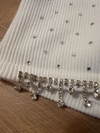 Elegante top de Zara, perfecto para ocasiones especiales. Su diseño combina un tejido texturizado con detalles de perlas. - Cuello redondo con adorno de perlas y detalle de flecos. - Manga corta con puño adornado con perlas y flecos.