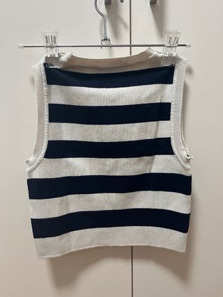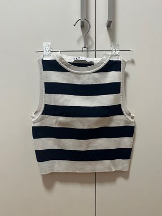 Precioso top de rayas de Zara, en tonos beige y azul marino. Es una prenda elegante y cómoda, ideal para cualquier ocasión. - Diseño de rayas horizontales. - Corte cropped. - Sin mangas.