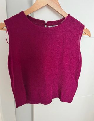 Top de Zara en color rosa con un acabado brillante. Es una prenda sin mangas, ideal para combinar. - Diseño con cuello redondo. - Cierre de cremallera en la espalda. - Tejido ligero y con textura.