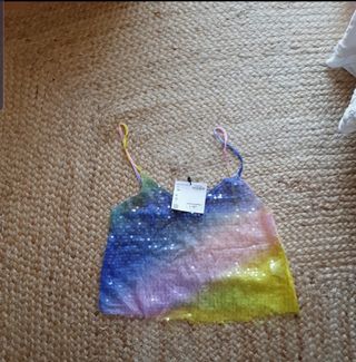 Precioso top de lentejuelas, usado solo una vez. ✨ - Diseño original con estampado multicolor y plateado. - Escote de pico. - Tirantes finos. - Corte cropped.