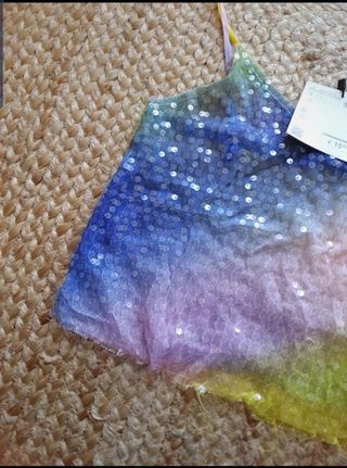 Elegante top corto con lentejuelas brillantes. - Diseño con tirantes finos. - Acabado con tul en el bajo. - Ideal para eventos o salidas nocturnas. Talla XS-S. Zara.