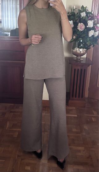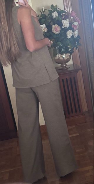 Conjunto de dos piezas de Zara, ideal para un look completo. top talla M y pantalón talla S. - Tejido de punto. - Diseño sin mangas en la parte superior. - Pantalón de corte ancho.
