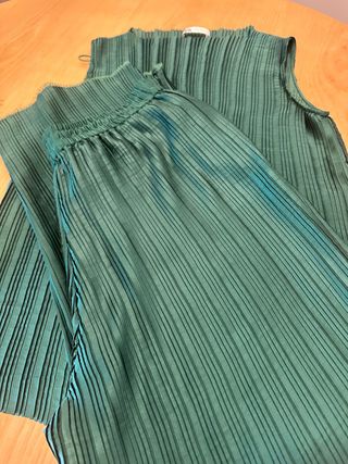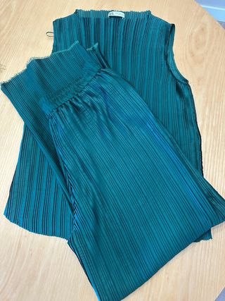 Conjunto de dos piezas formado por un top sin mangas y un pantalón. - Top con cuello redondo y acabado deshilachado. Talla S - Pantalón con cintura elástica. Talla L - Tejido plisado con finas rayas verticales. Sólo lo usé un dia