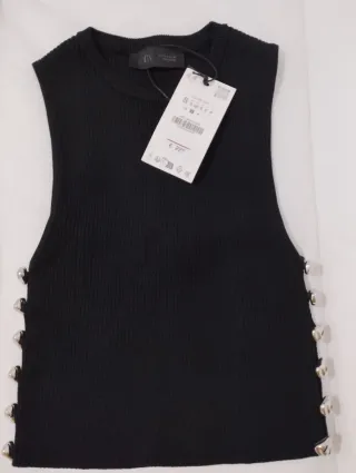 Top de punto negro de Zara con detalles de botones metálicos en los laterales. - Diseño sin mangas. - Cuello redondo. - Tejido de canalé.