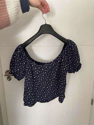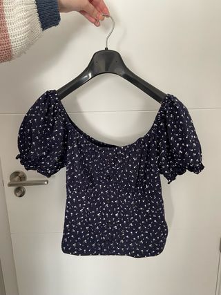 Bonito top con estampado floral sobre fondo azul marino. - Escote Bardot. - Mangas abullonadas. - Detalle de botones en la parte delantera. Marca Marta Barcala.