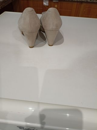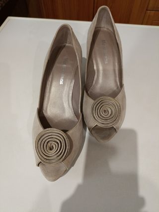 Zapatos color topo ideal para combinar. Especial celebraciones. su tacon es de 10 cm con plataforma de 2 cm. Ante en perfecto estado. Pone 38 pero yo tallo 37 y me estan perfectos. Tiene trasera de correa para adaptarlo