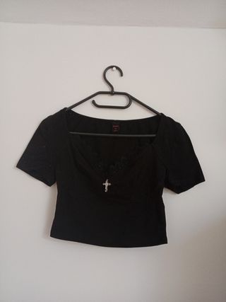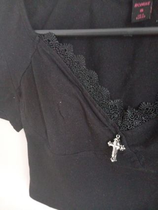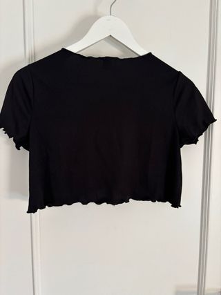 top negro de tela arrugada talla 38, por la característica del tejido se puede adaptar a una talla mucho mayor.