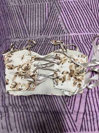 Este top tipo corset es una prenda elegante y llamativa. - Diseño de encaje en la parte superior. - Detalle de perforaciones en la tela. - Tirantes ajustables.