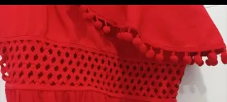 Top largo asimétrico en color rojo, con un diseño original y detalles que marcan la diferencia. - Diseño asimétrico de un solo hombro. - Adornado con pequeños pompones en el escote y el bajo. - Detalle de tejido calado en la zona de la cintura. - Corte largo y fluido.