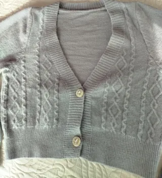 Conjunto de dos piezas compuesto por un cárdigan y un top de tirantes. - Cárdigan con botones y diseño de rombos. - Top de tirantes con escote en V. - Tiene una tonalidad morada grisácea.