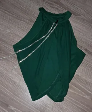 Top de fiesta en color verde, con un diseño único. - Detalle de cadenas plateadasy brillantes - Cierre con dos botones en el cuello. - Diseño halter.