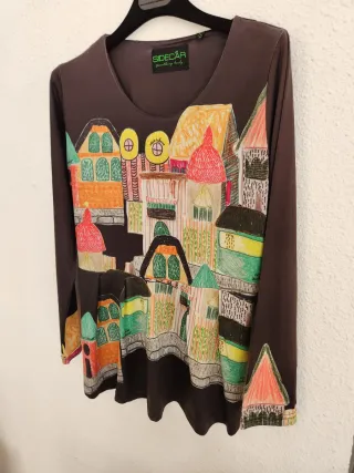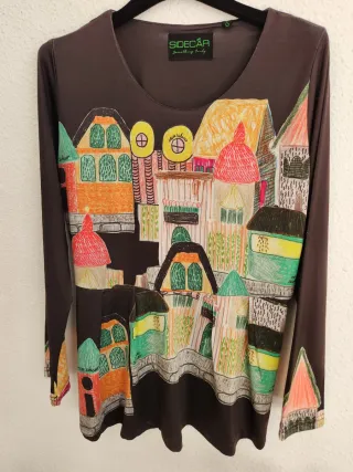 Camiseta de manga larga con estampado artístico de un paisaje urbano. Cuello redondo. Talla/ S
