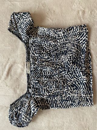 Top de Stradivarius con un llamativo estampado. - Diseño fruncido en el delantero. - Mangas cortas abullonadas. - Escote cuadrado.