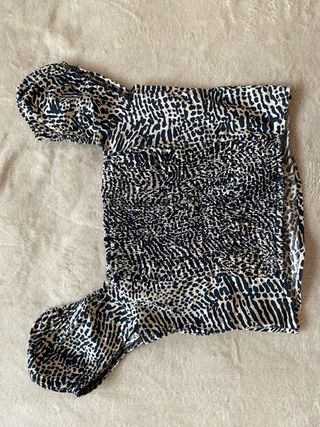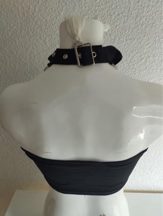 Top negro con un acabado brillante y diseño halter. - Diseño cruzado en el cuello. - Cremallera lateral oculta. es la XS pero talla grande, tipo S-M