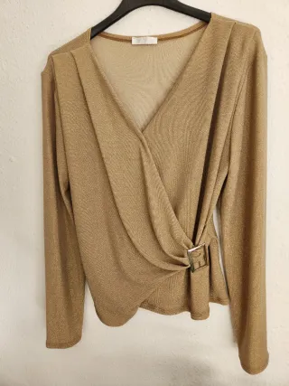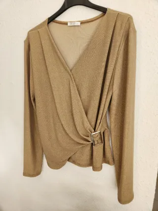 Top con tejido de lame y detalle de hebilla.Diseño cruzado.Manga larga. Adorno metálico en la cintura. Hasta 44 cm de axila a axila Talla/ U