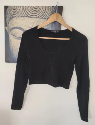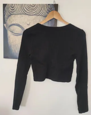 Top negro con diseño acanalado y detalles cut-out. Precio Original: 35 € - Mangas largas. - Escote pronunciado con tiras cruzadas. - Tejido elástico y cómodo.