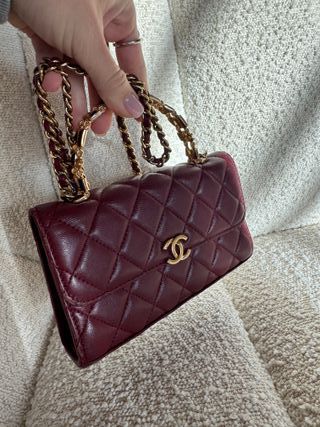 Elegante bolso Chanel Classic Mini Top Handle en un precioso color burdeos. - Diseño acolchado. - Cadena dorada. - Logo CC dorado.