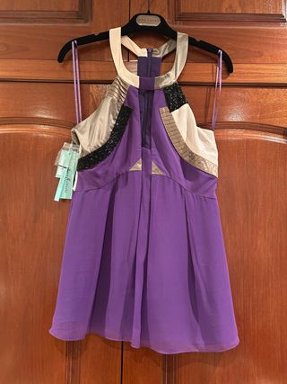 Elegante top de seda con un diseño único. - Detalles de pedrería y aplicaciones metálicas. - Escote halter. - Cremallera central.