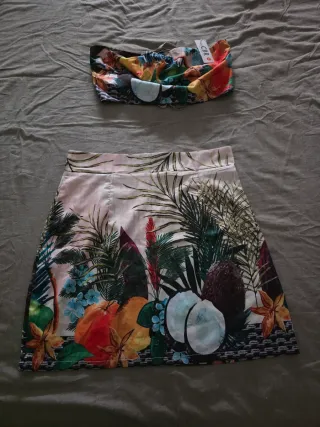 Conjunto de dos piezas con un vibrante estampado tropical. - Top estilo bandeau. - Falda mini. - Diseño con frutas exóticas y hojas.
