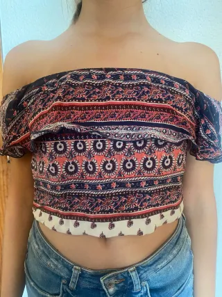 Top de Bershka con un bonito estampado y diseño de hombros descubiertos. - Diseño sin mangas. - Estampado multicolor con detalles en rojo y azul marino. - Corte crop top.