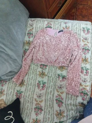 Festivo, de noche, peplum con vuelo. El diseño con volantes en el bajo le da un toque femenino y juguetón. Detalles: Totalmente cubierto de lentejuelas y adornos de textura a lo largo de toda la tela. Las lentejuelas son de un tono oscuro, con un brillo tornasolado, creando un efecto de brillo sutil y elegante. El tejido de base es de encaje o con una textura grabada.Ideal para: Fiestas, eventos especiales, salidas nocturnas o para añadir un toque de glamour a un conjunto casual con jeans o pantalones anchos.