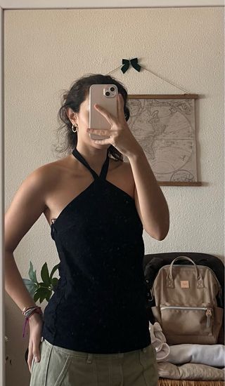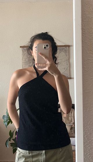 Elegante top negro con lentejuelas brillantes. Diseño halter que realza los hombros. - Acabado con lentejuelas. - Corte halter. Es talla M pero yo diría que talla como una S